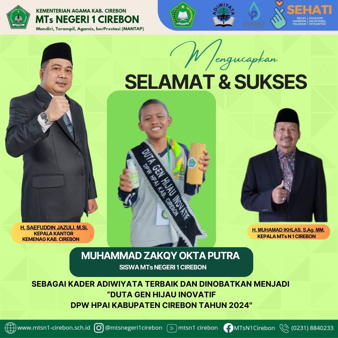 Ada lima siswa dari MTsN 1 Cirebon yang mengikuti kegiatan Green Camp. Zakqy adalah salah satunya, ia terpilih menjadi Duta Gen Hijau Inovatif setelah melalui serangkaian penilaian, dan menjadi yang paling unggul diantara 15 sekolah jenjang SMP lainnya. Penilaian tersebut meliputi tes intelegensi (cerdas cermat), diskusi kelompok, kreativitas seni, dan penilaian sikap. Ada tiga kategori Duta Gen Hijau yakni: 1) Duta Gen Hijau Aktif, 2) Duta Gen Hijau Komunikatif, 3) Duta Gen Hijau Inovatif. Seluruh Duta Gen Hijau Kabupaten Cirebon akan mewakili berbagai kegiatan Adiwiyata tingkat kabupaten hingga tingkat nasional.